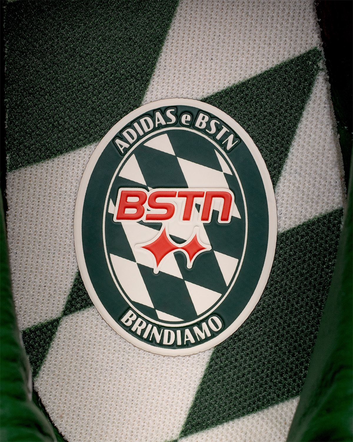 The ‘Salute’ [Italian ‘Cheers’] inscriptions celebrate this ‘home away from home’ relationship between Monaco di Baviera and its neighbors from the southern side of the Alps. The corresponding oval logo – derived equally from a beer coaster and a trattoria sign – also subtly adds the classic Bavarian checkered pattern to the tongue and insole of the shoe.