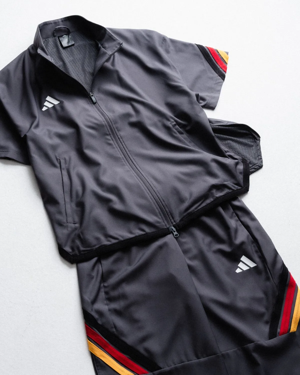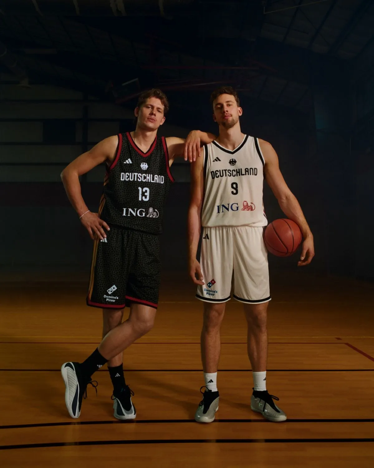 Showcased by Franz and Moritz Wagner, 3×3 Olympic champion Marie Reichert and more DBB royalty, the jerseys come with a sharp balance of tradition and detail. The home kit keeps it classic in white with fine pinstripes, black piping at the V-neck and armholes, and side Three Stripes in black, red, and gold, while ‘Deutschland’ lettering, the federal eagle, and adidas branding define the chest.