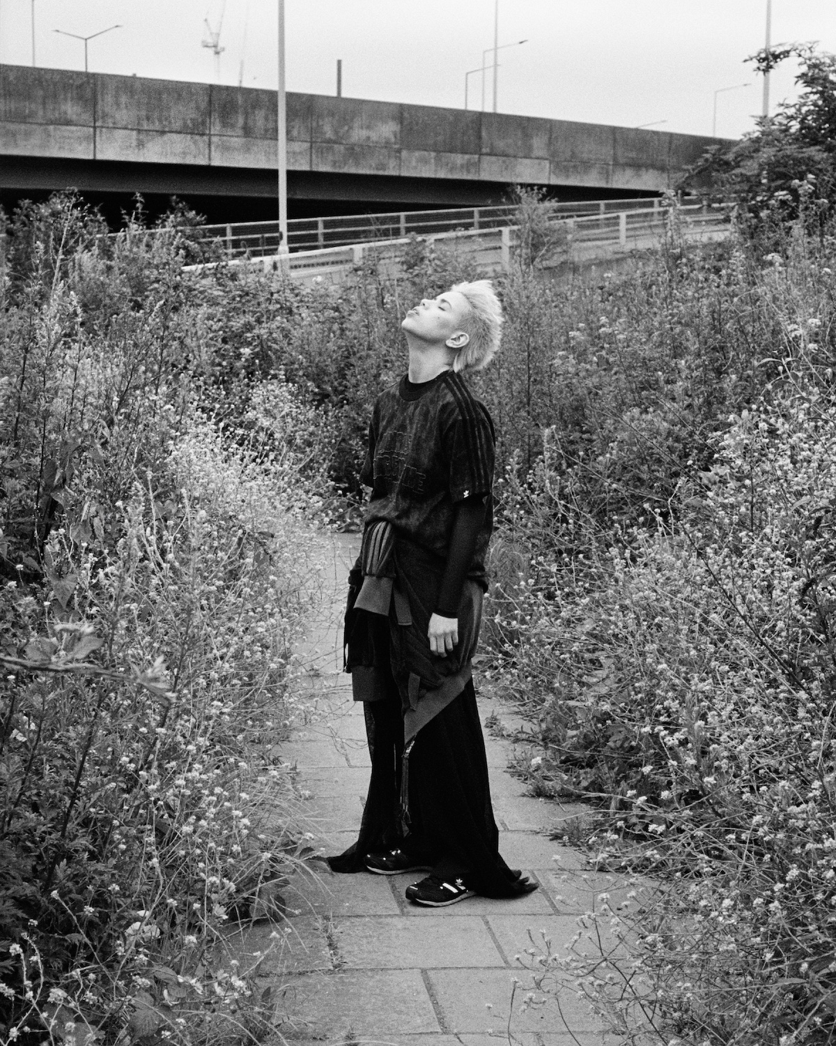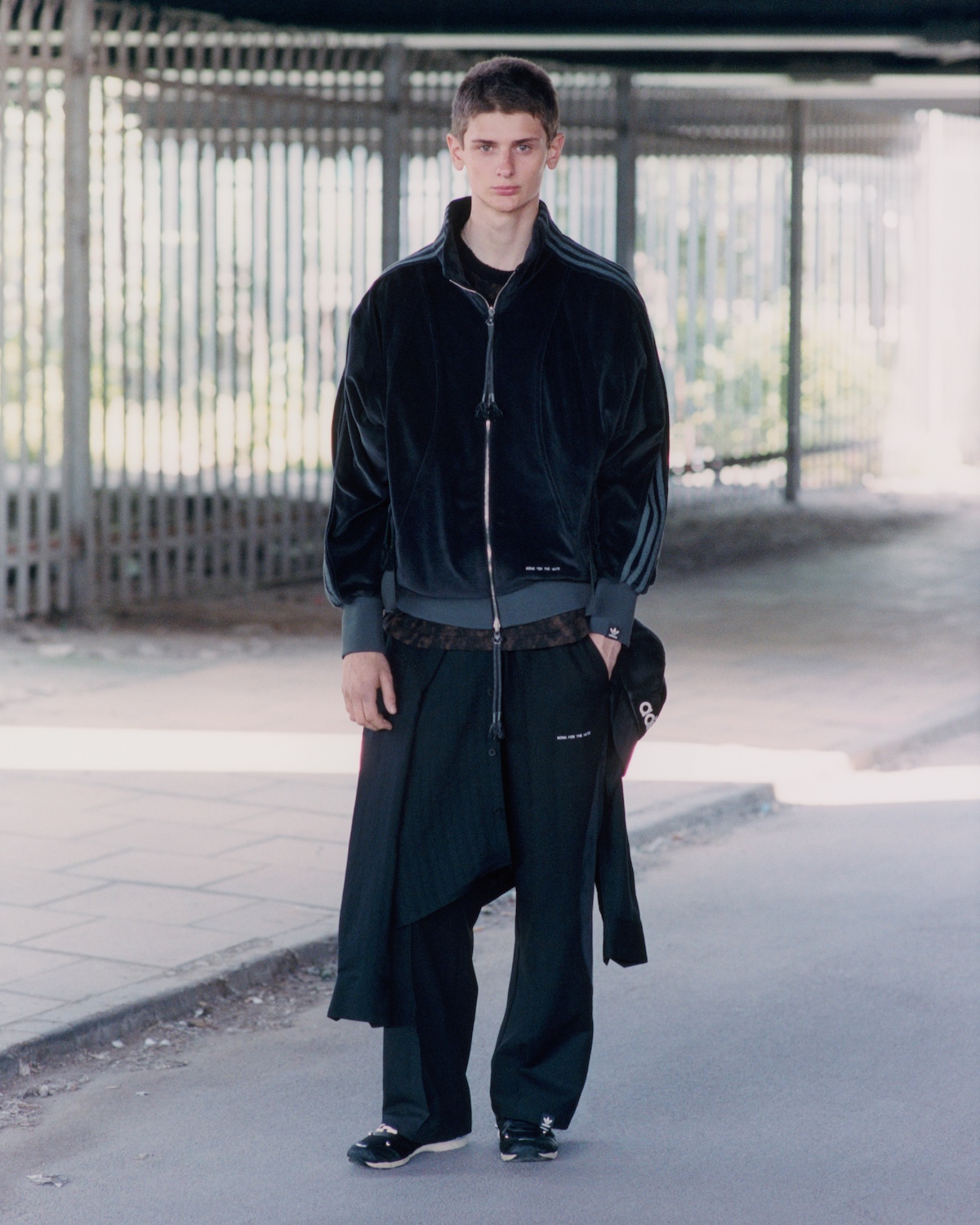 The accompanying apparel continues this spirit of distortion and reconstruction on velvet track jackets, oversized gabardine overshirts, washed-out tartan pleated trousers, and reworked track pants that offer a skewed take on sporting tradition.