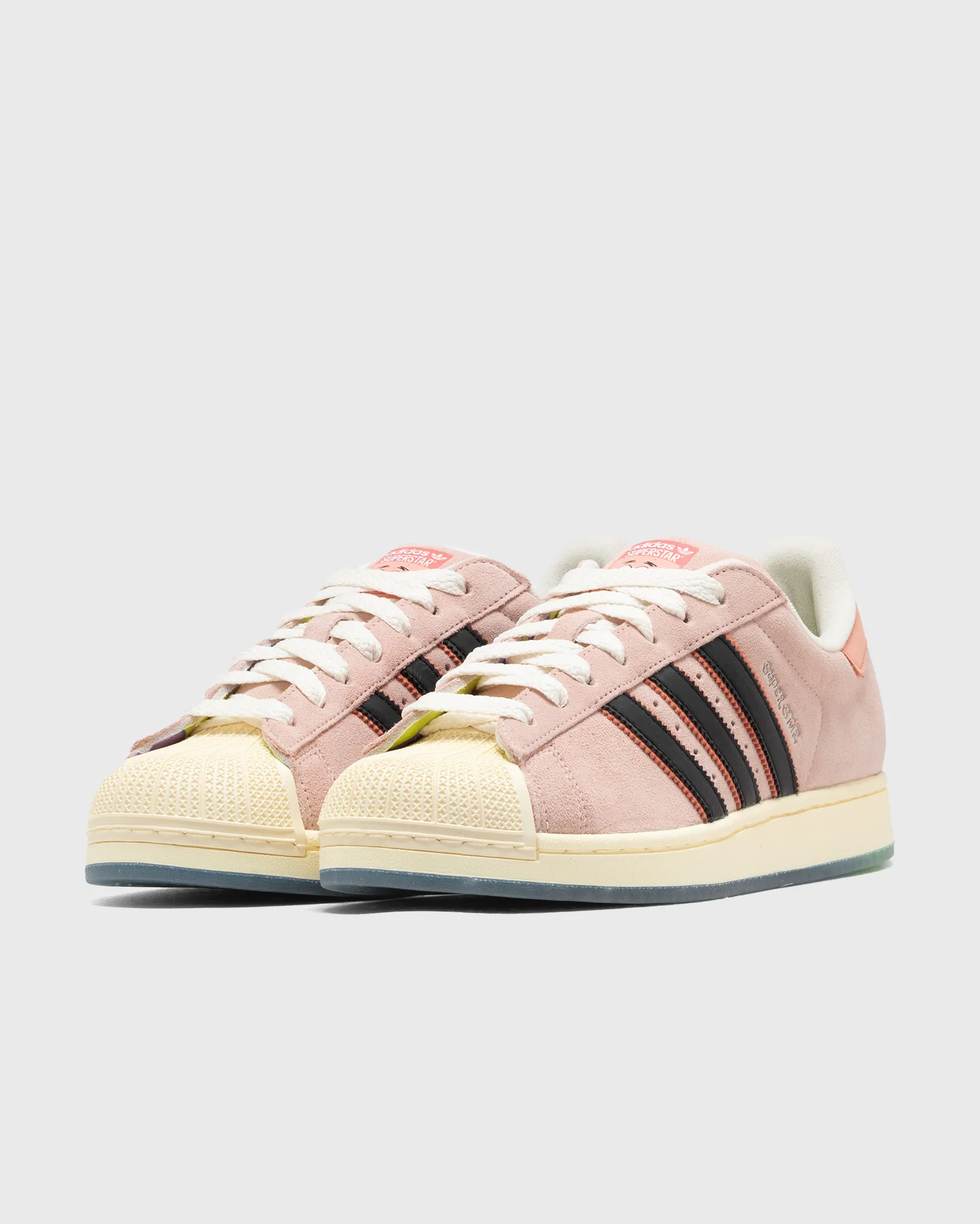 The adidas x Patrick Superstar goes all-in on the starfish’s pastel palette, swapping the usual leather for soft pink suede and a textured beige shelltoe. His face and signature animate the tongue, while the insoles reference both the series logo and Patrick’s floral shorts. Black-and-red Three Stripes anchor the upper, set above a beige midsole and a translucent blue outsole patterned with Bikini Bottom’s sky. Alongside white laces, a green-and-purple floral set gives additional Patrick vibes.
