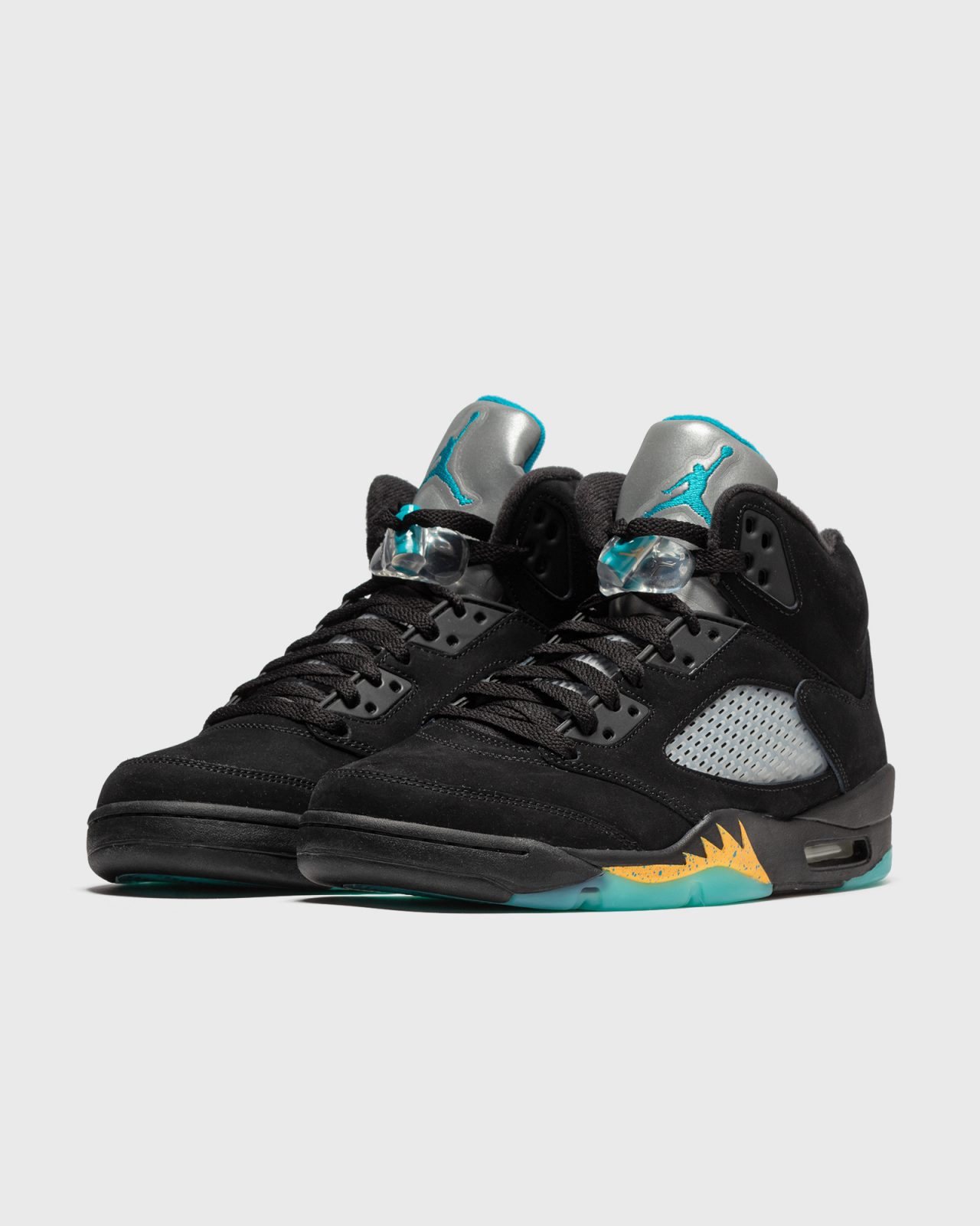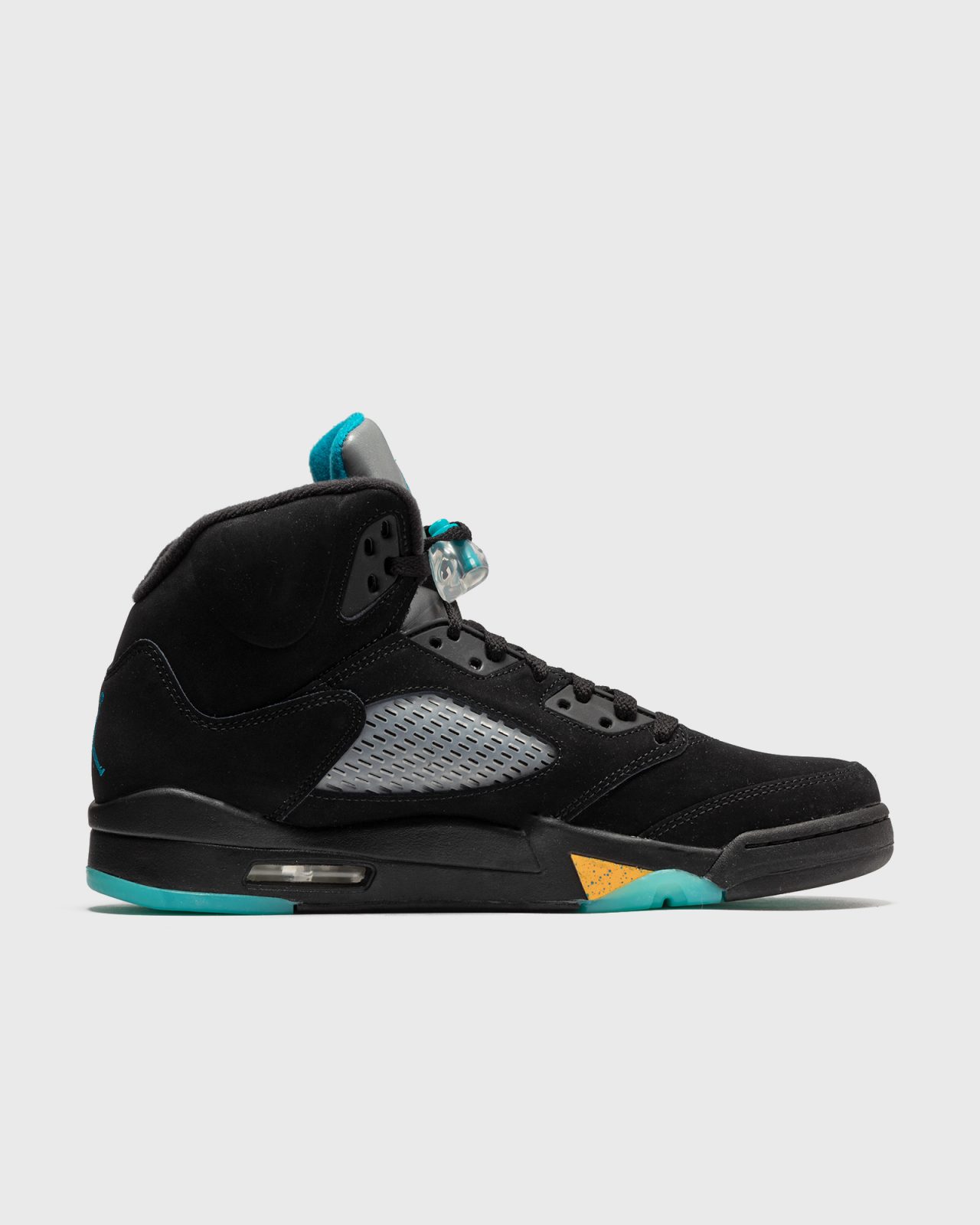 The latest edition of the fan-favorite Air Jordan V retro series features a clean black upper with Aquatone and Taxi Yellow details. Key elements of the characteristic AJV design – including the reflective tongue, see-through outsole, and aviation-inspired outsole spikes – boast the eye-catching aquatic hues.