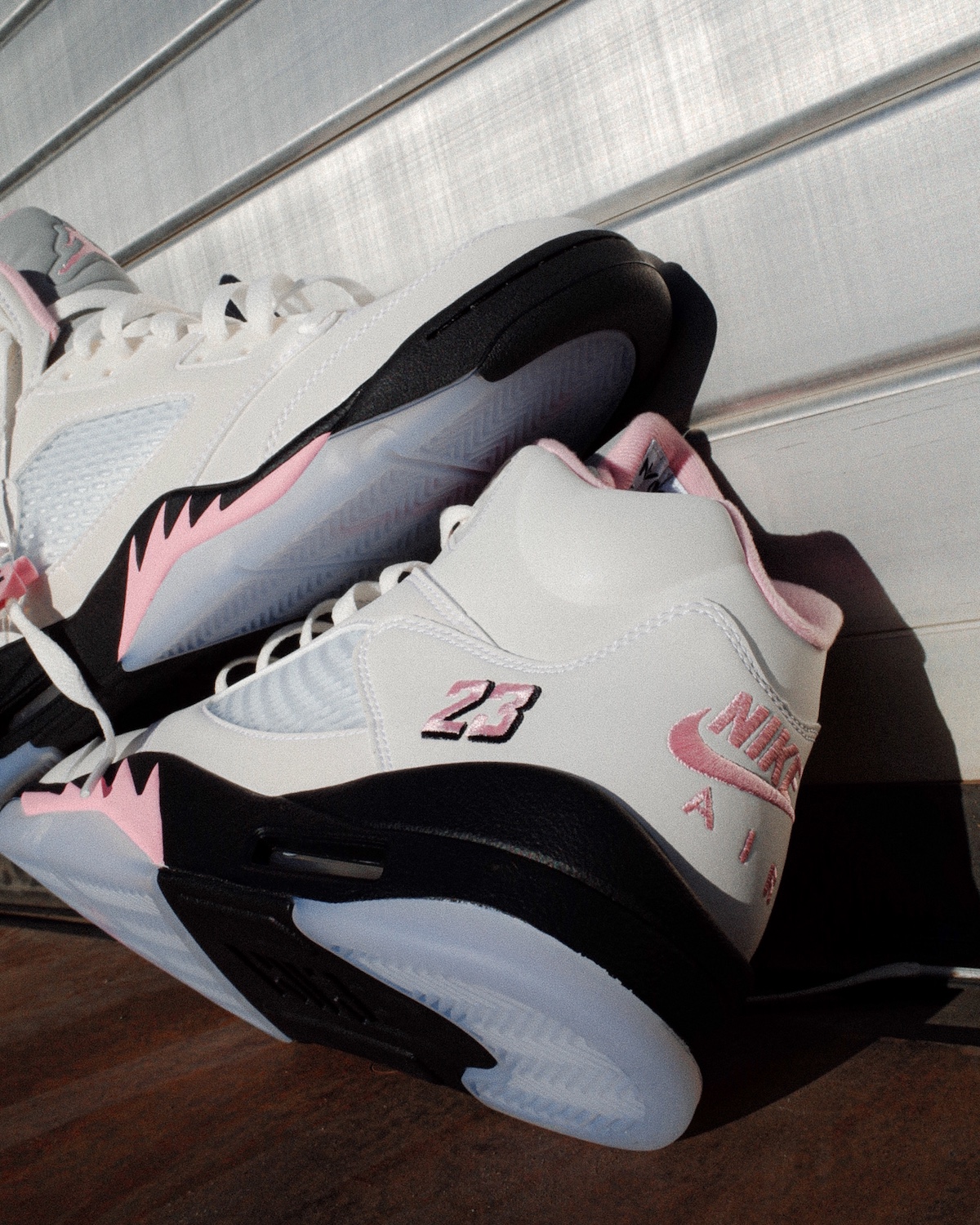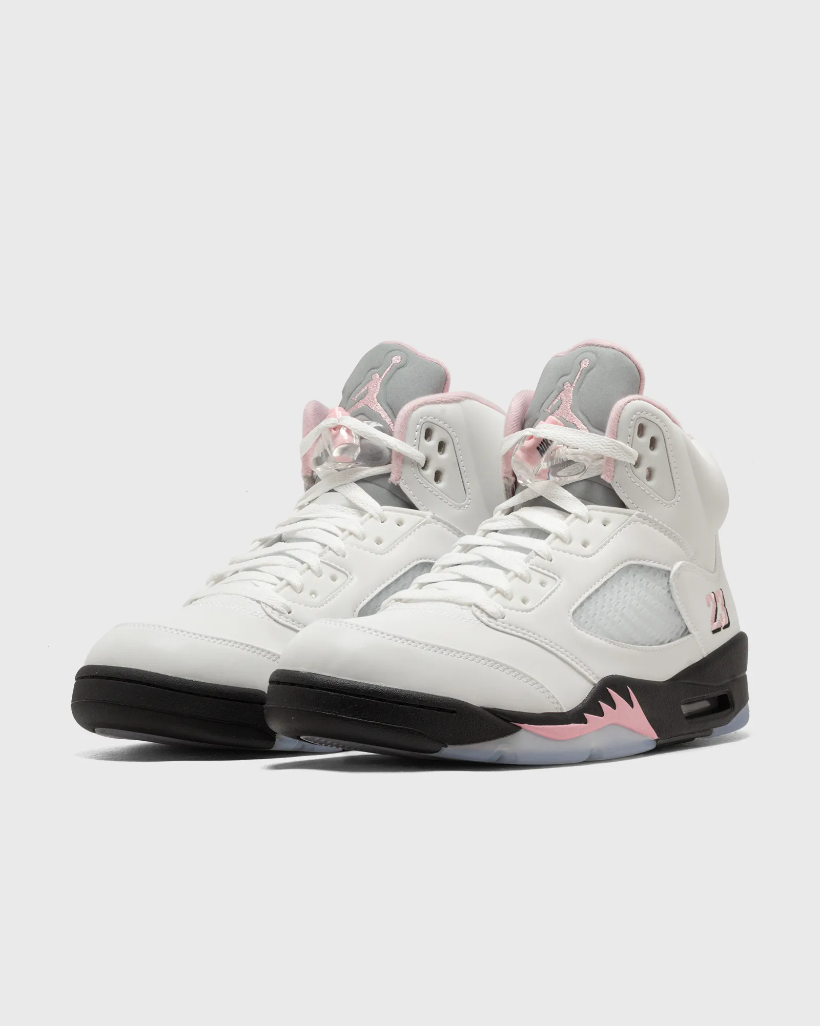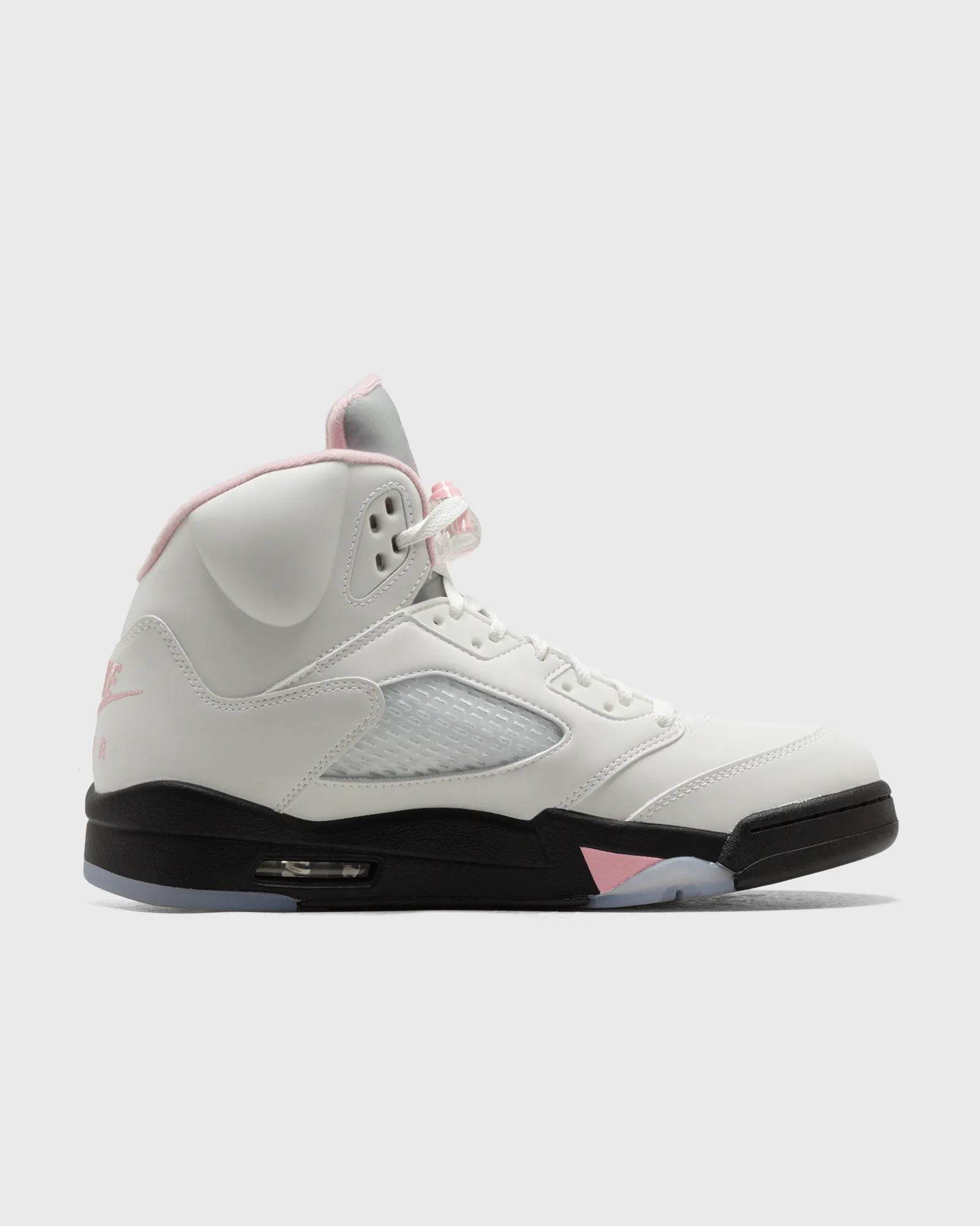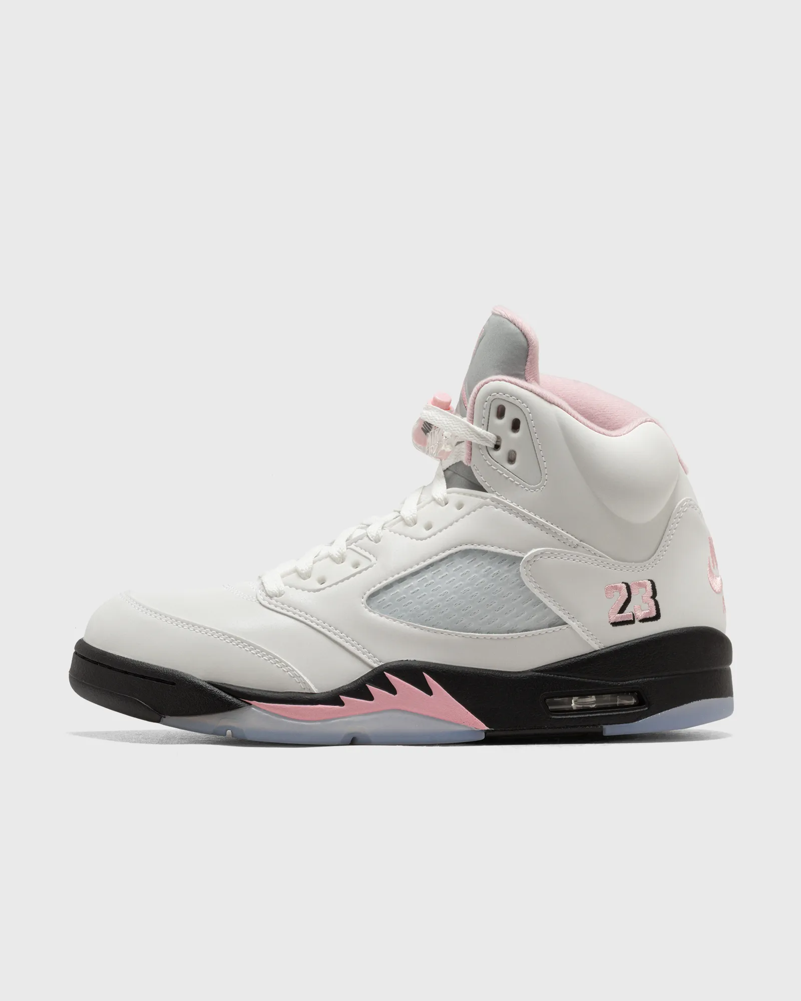While the color blocking on this release follows a classic pattern of a crisp white upper on top of a black mid- and clear outsole, the AJ V ‘Medium Soft Pink’ introduces dashes of its eponym color on various places across the silhouette, most notably the embroidered number 23 on the lateral heel and the iconic Nike Air branding on the back of the shoe.