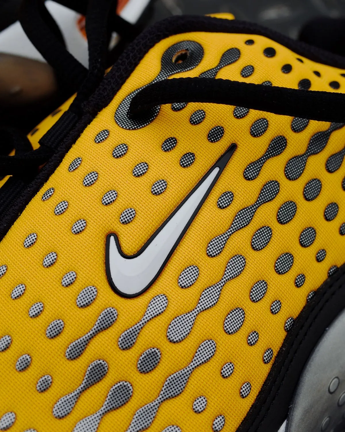 Running like strings of pearls across the upper, the signature overlays shift from metallic silver at the toe to deep black at the heel – a subtle gradient that amplifies the silhouette’s motion even at a standstill. Underfoot, the Tuned Air cushioning system ensures the signature comfort and bounce that defined the model’s rise through sneaker culture. The black-and-white midsole, laced with yellow-tinted Air units, rounds out the pair.