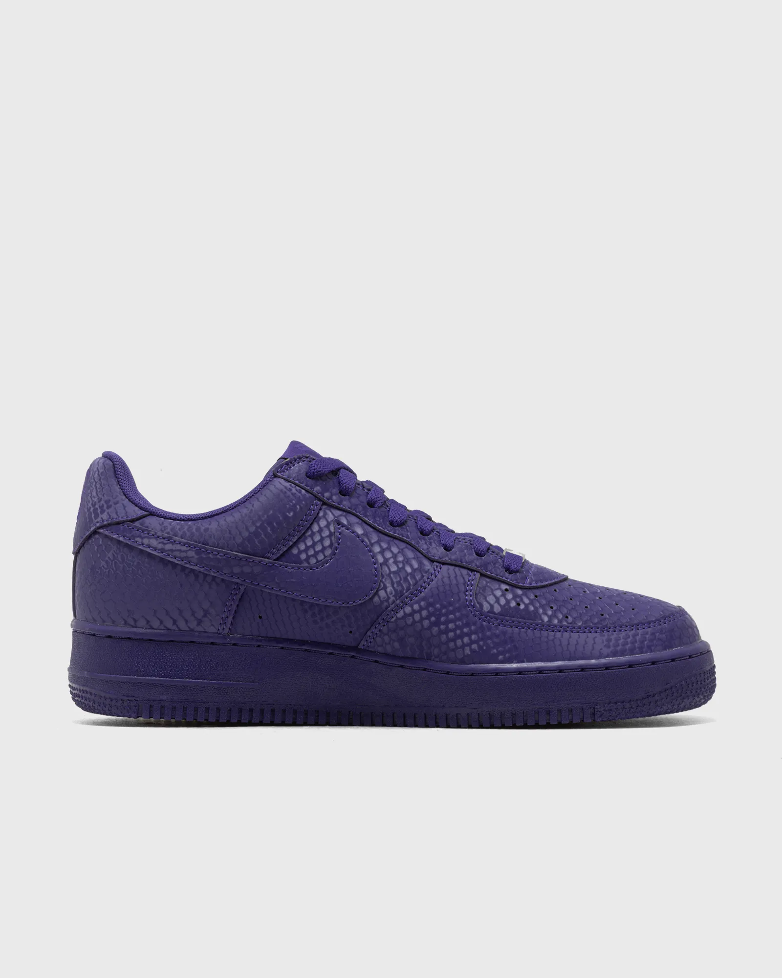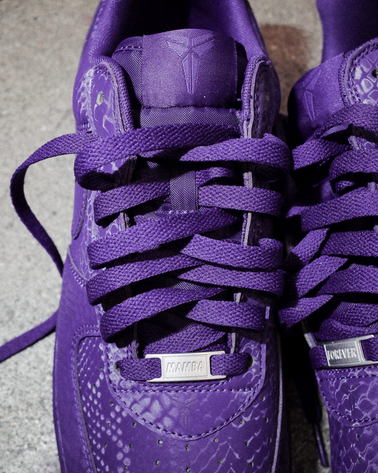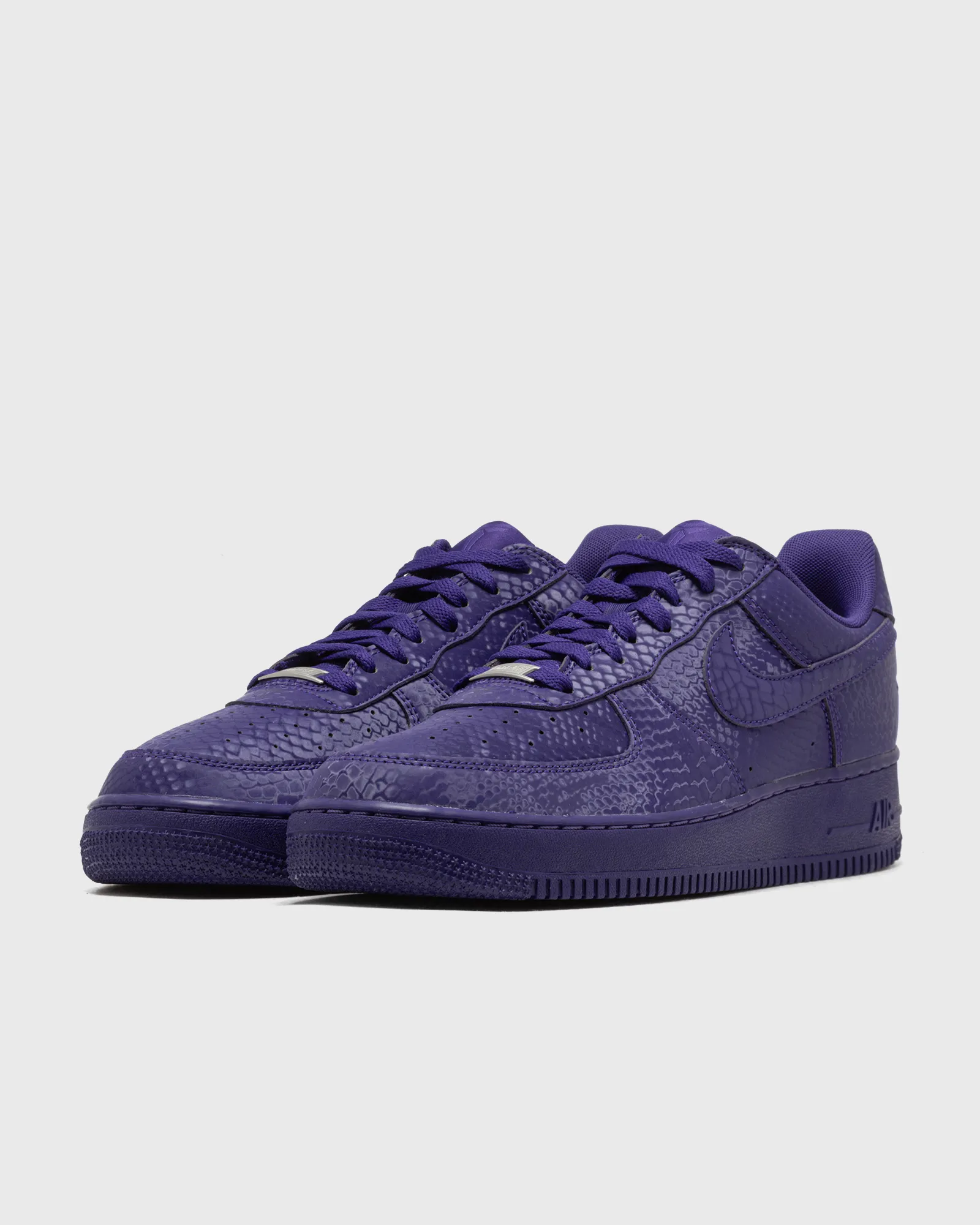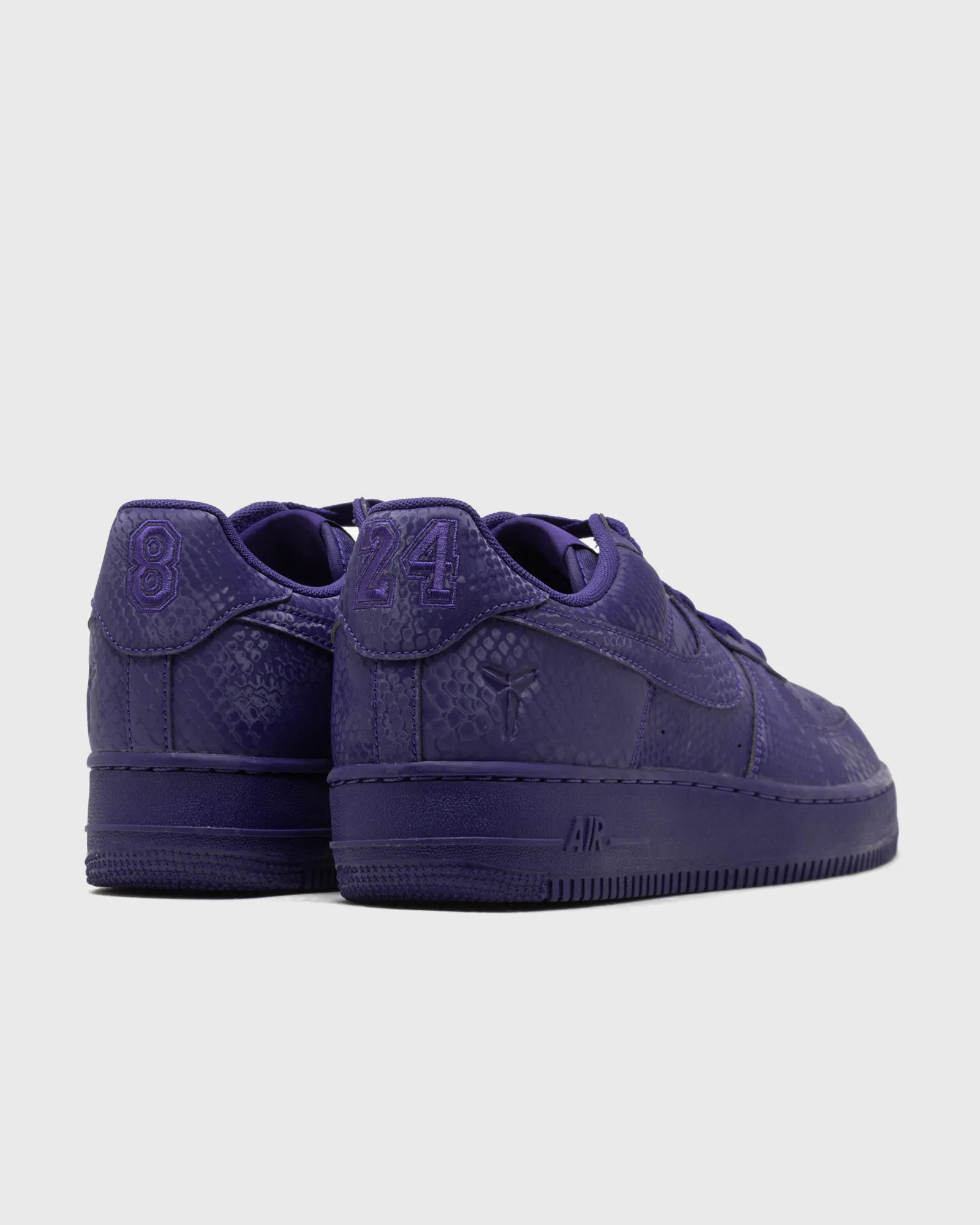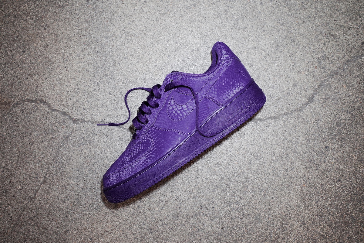 Dubbed Court Purple, this particular colorway pays homage to the on- and offcourt legacy of the AF1 – for the Mamba himself and so many more. Talk about putting the purple in ‘purple and gold’ for Lakers and Kobe fans everywhere! Fittingly, this special edition features a distinct snakeskin pattern all over the upper and a nod to the legend’s jersey numbers, 8 and 24, embroidered on the heels of the shoe.