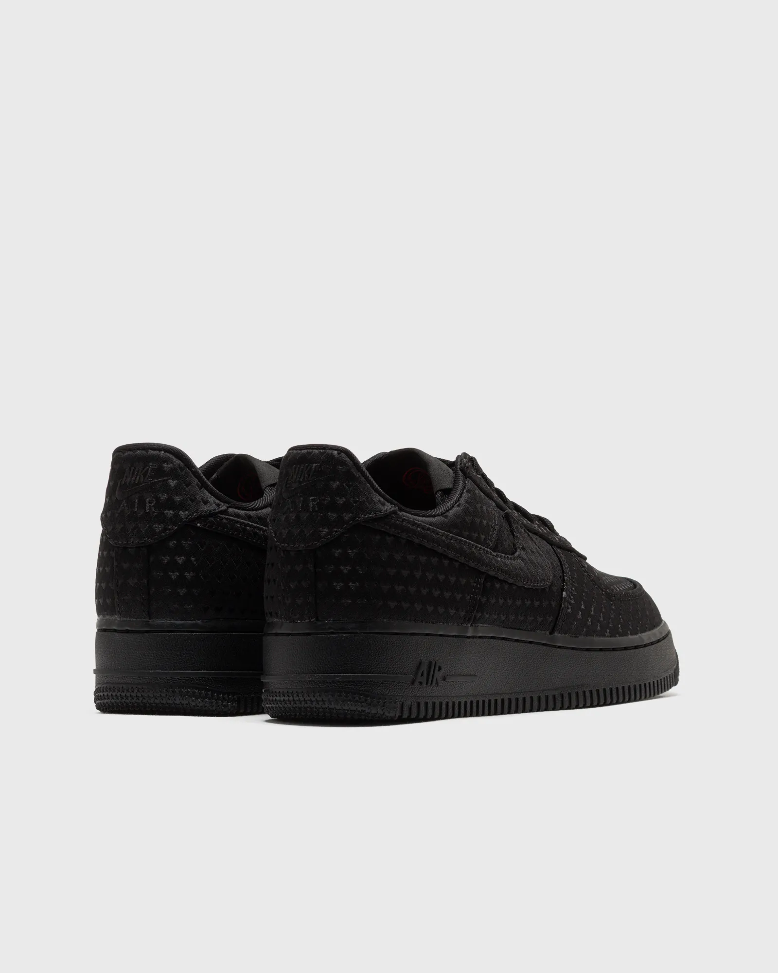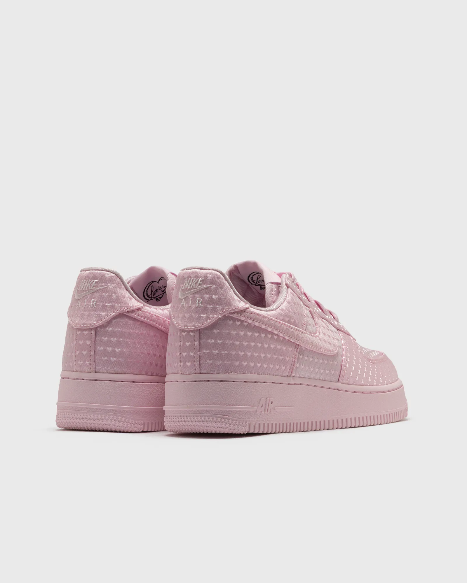 Arriving in Pink Foam and Black colorways, both pairs lean on woven heart detailing across the upper, catching light subtly and adding depth. A hidden ‘Love Is In The Air’ graphic on the tongue’s inside and a removable heart-shaped locket charm nod to past Valentine’s drops. Tonal Swooshes, embroidered Nike Air heel branding, and classic Air cushioning underfoot round out the pairs.