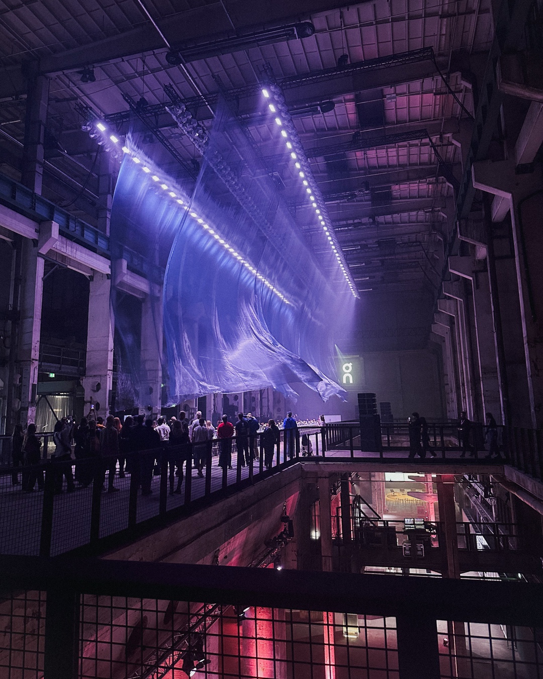 The distinct industiral background clashes with On’s future-driven design across 7,000 square meters, offering visitors a first-hand experience of theLightSpray™ robot that turns a 1.5 km long thread into a lightweight shoe upper in a single automated three-minute step. The result is the brand’s lightest performance shoe to date that also cuts the carbon emissions of the shoe by 75% compared to other On competition shoes.