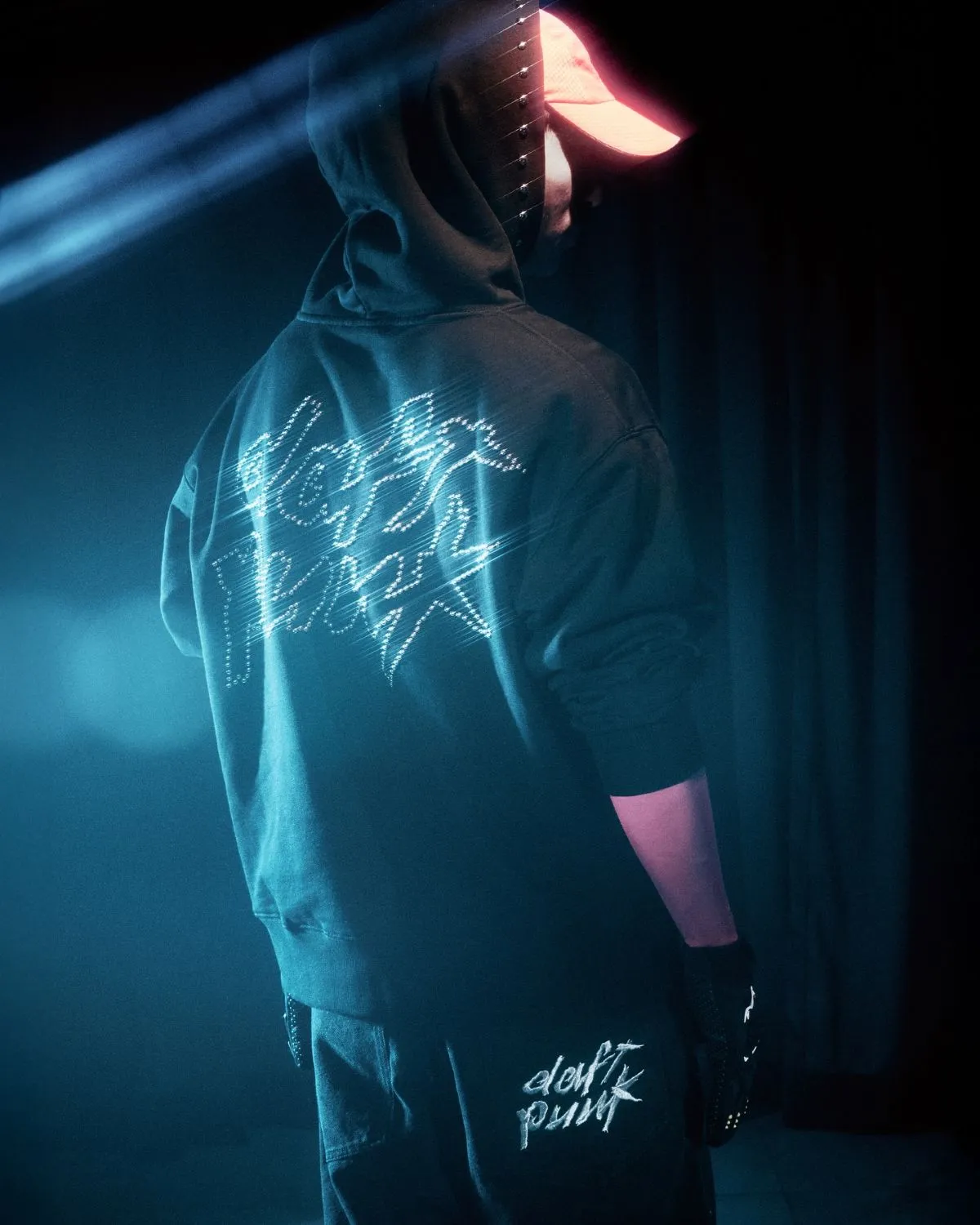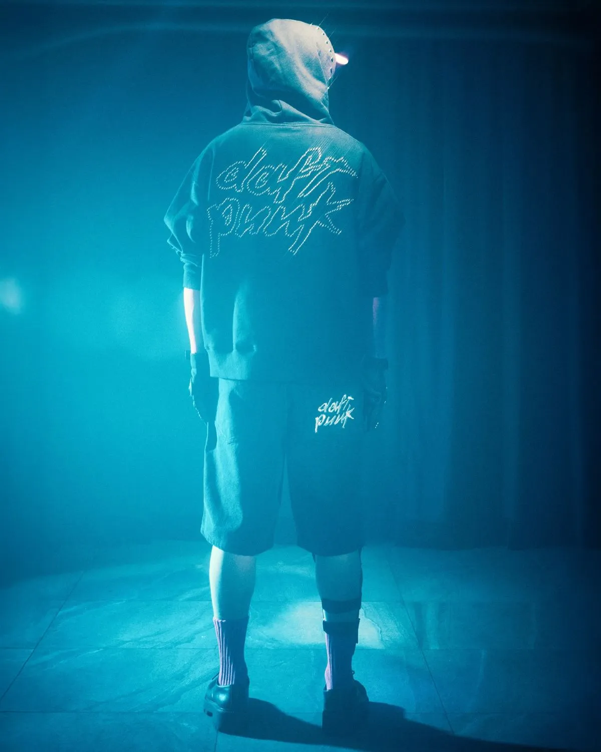 Standout pieces include a full-zip hoodie that encloses the face in a silhouette echoing Daft Punk’s helmets, alongside embroidered logo shorts, helmet-shaped bookends, and a football featuring Random Access Memories artwork – all marked by co-branded detailing from Daft Punk and PLEASURES. Fine details like studded logos also reinforce the duo’s elusive, intergalactic persona.