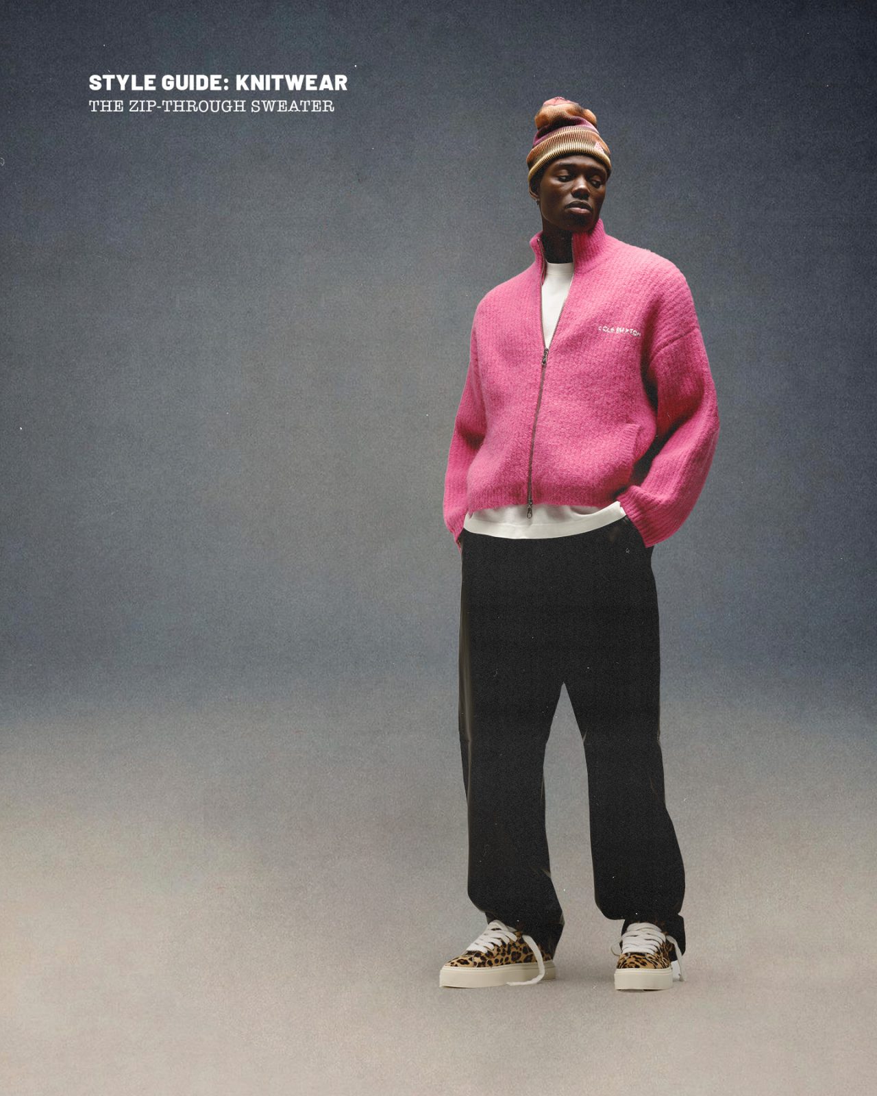 A zip-through sweater makes for a perfectly versatile layering piece: The full zipper allows for adjustable warmth and effortless styling, letting you showcase just enough of an underlying t-shirt or shirt. When worn in flashy colors, it pairs exceptionally well with equally striking footwear, as the distance between the two ensures they complement each other rather than compete.