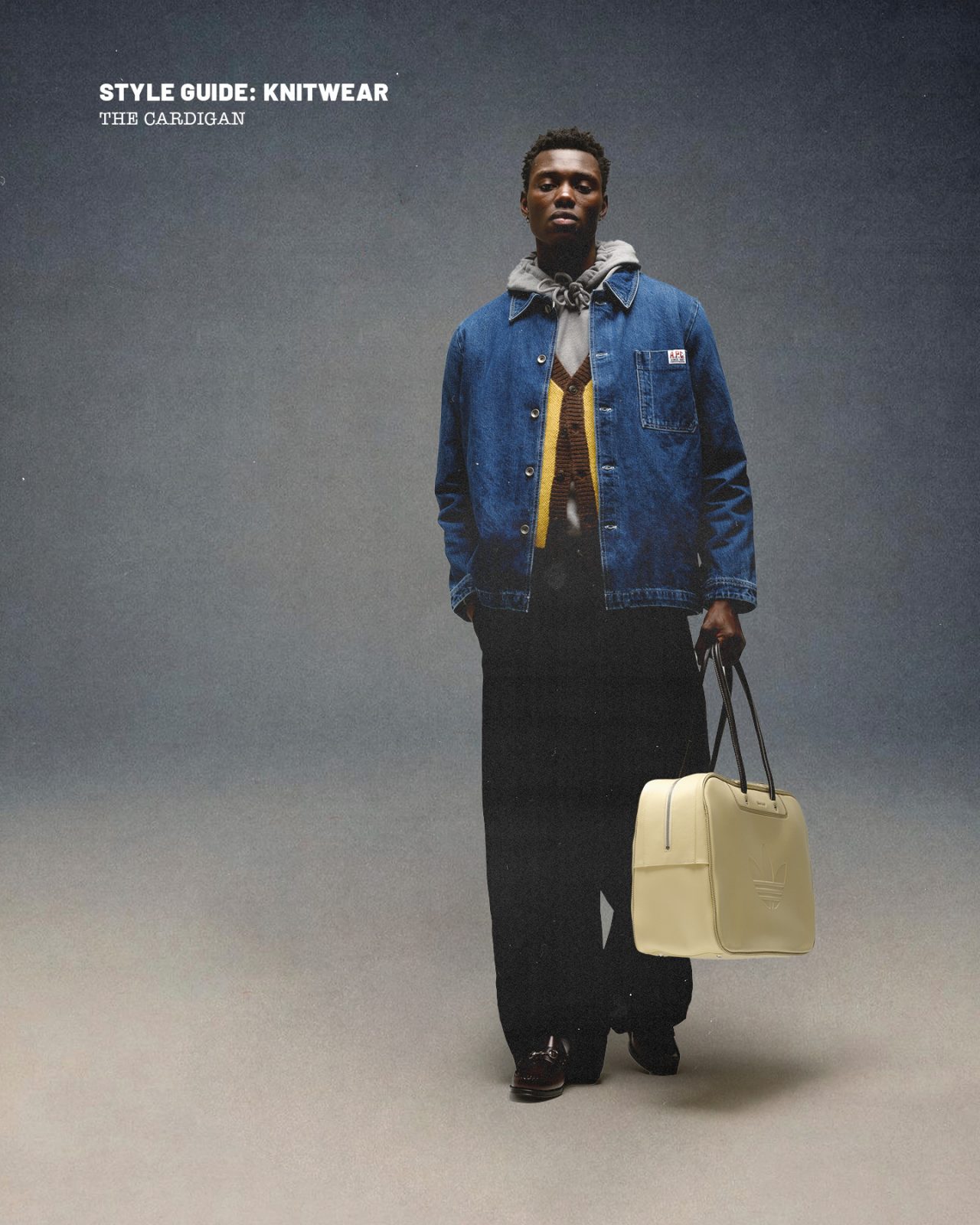 A colorful cardigan instantly elevates your cold-weather wardrobe, offering a perfect canvas for creative layering. Pair it with a roomy denim jacket and/ or a relaxed hoodie and you have a fit that’s as functional as it is stylish on frosty days. The cardigan’s boldness finds balance in classic footwear, like a pair of timeless Weejuns here, grounding the look with an air of refinement.