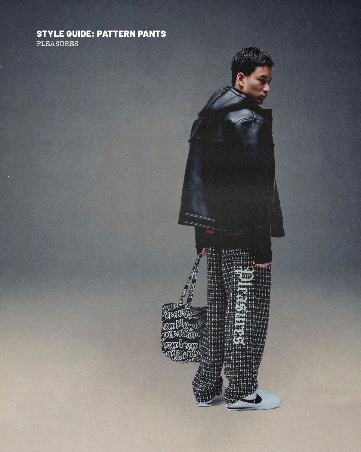 Patterned pants with a more muted design bring a laid-back, effortlessly cool vibe to an outfit while leaving room to experiment with bolder upper layers. The pants’ subdued tone serves as a perfect canvas for statement pieces, like this vibrant football jersey sweater that adds a pop of color and energy to the look.