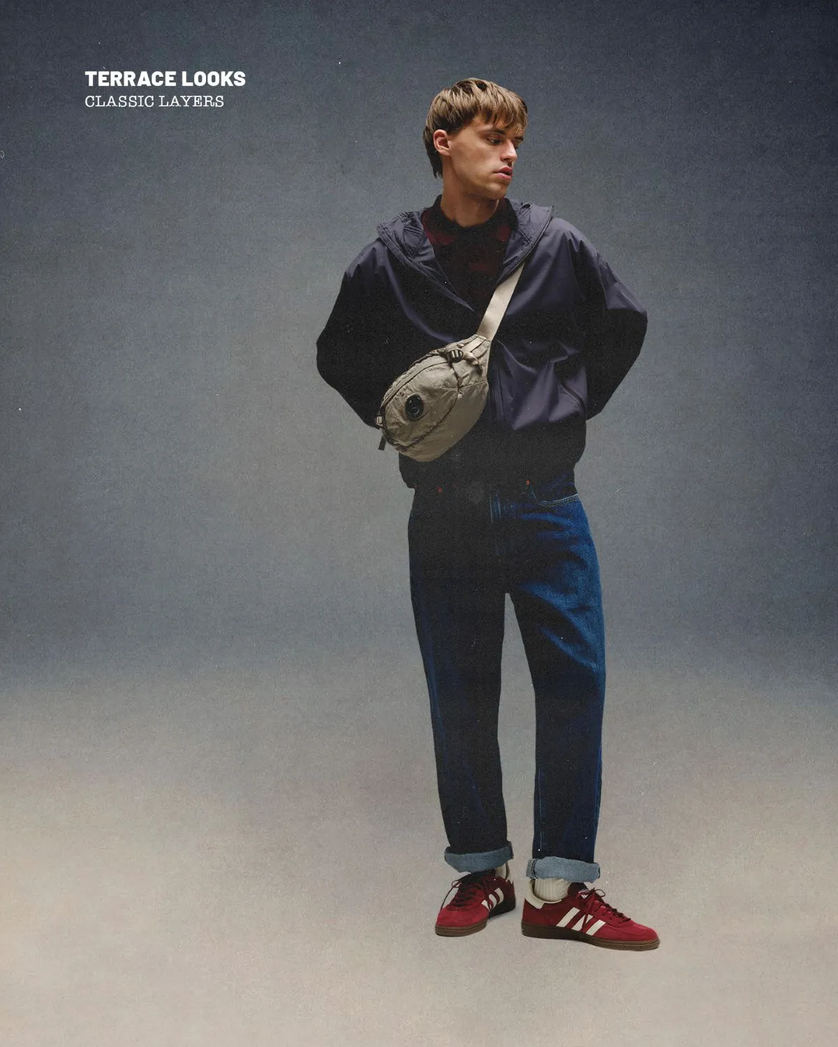 Balanced out with loose straight Levi’s 568 jeans, the silhouette stays relaxed without looking baggy while a waist bag from C.P. Company brings in Italian luxury vibes. On foot, the adidas Handball Spezial adds a touch of history – a silhouette originally made for German handball courts but later adopted by English football fans on their European away days.