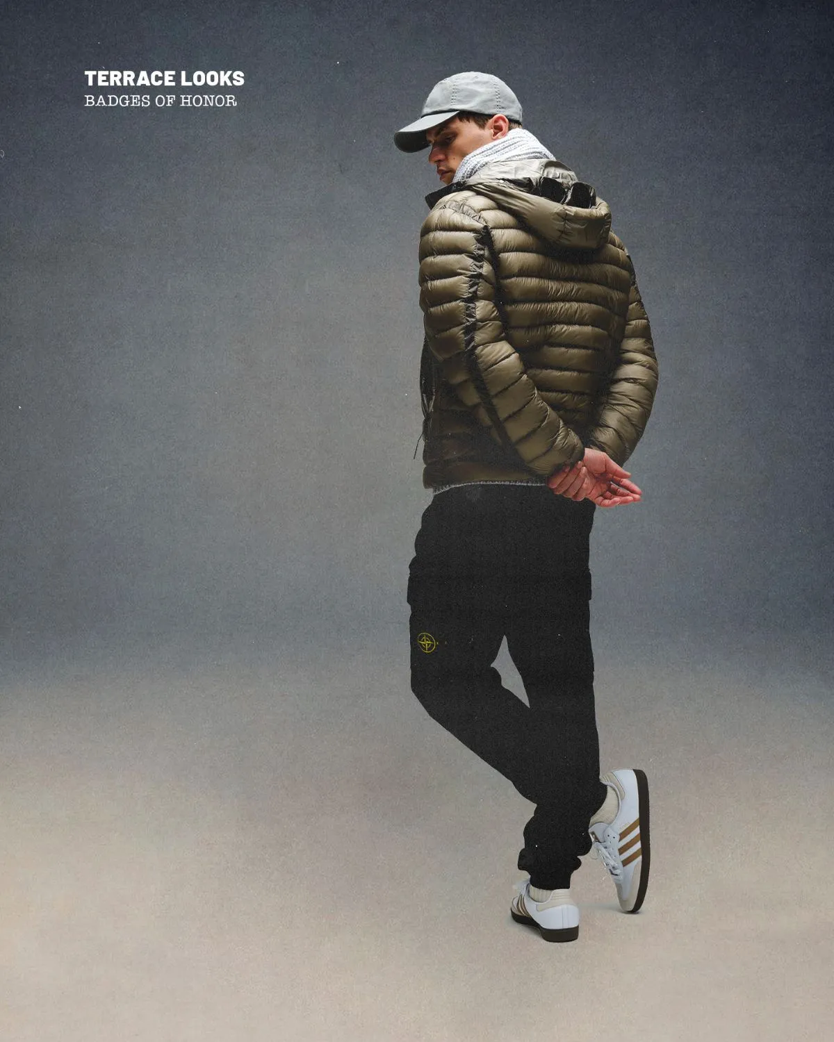 Accessories are kept minimal but intentional with the classic Polo Ralph Lauren cap complementing the outerwear. At ground level, the adidas Samba OG keeps the story going – a streamlined classic that was picked up by traveling English supporters abroad, who, intrigued by sportswear unfamiliar on the island and keen to stand out, helped cement its status within terrace culture.