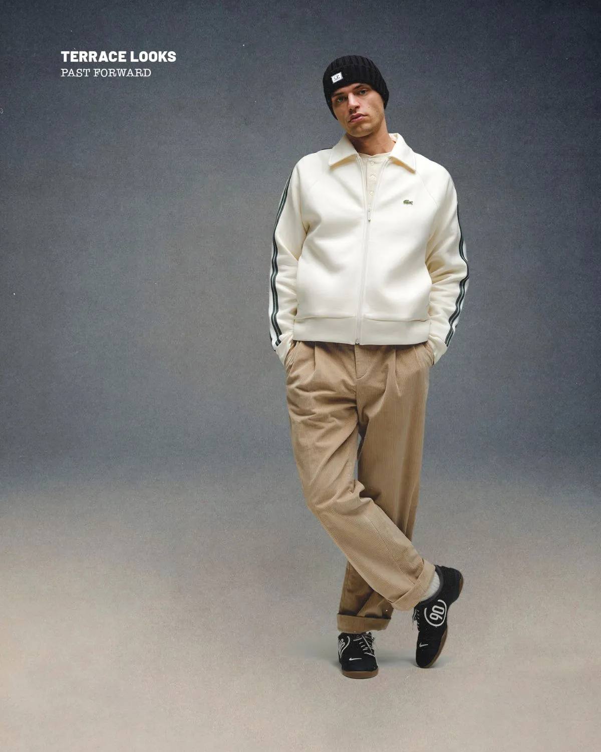 In terrace style, it’s the mix of premium sportswear with personal flair – standing out without straying from the code, kind of. This look taps into that energy, starting with a Lacoste zip sweatshirt layered over a Polo Ralph Lauren Henley longsleeve. Both pieces add a touch of preppy minimalism, balanced by a subtle C.P. Company knit cap.
